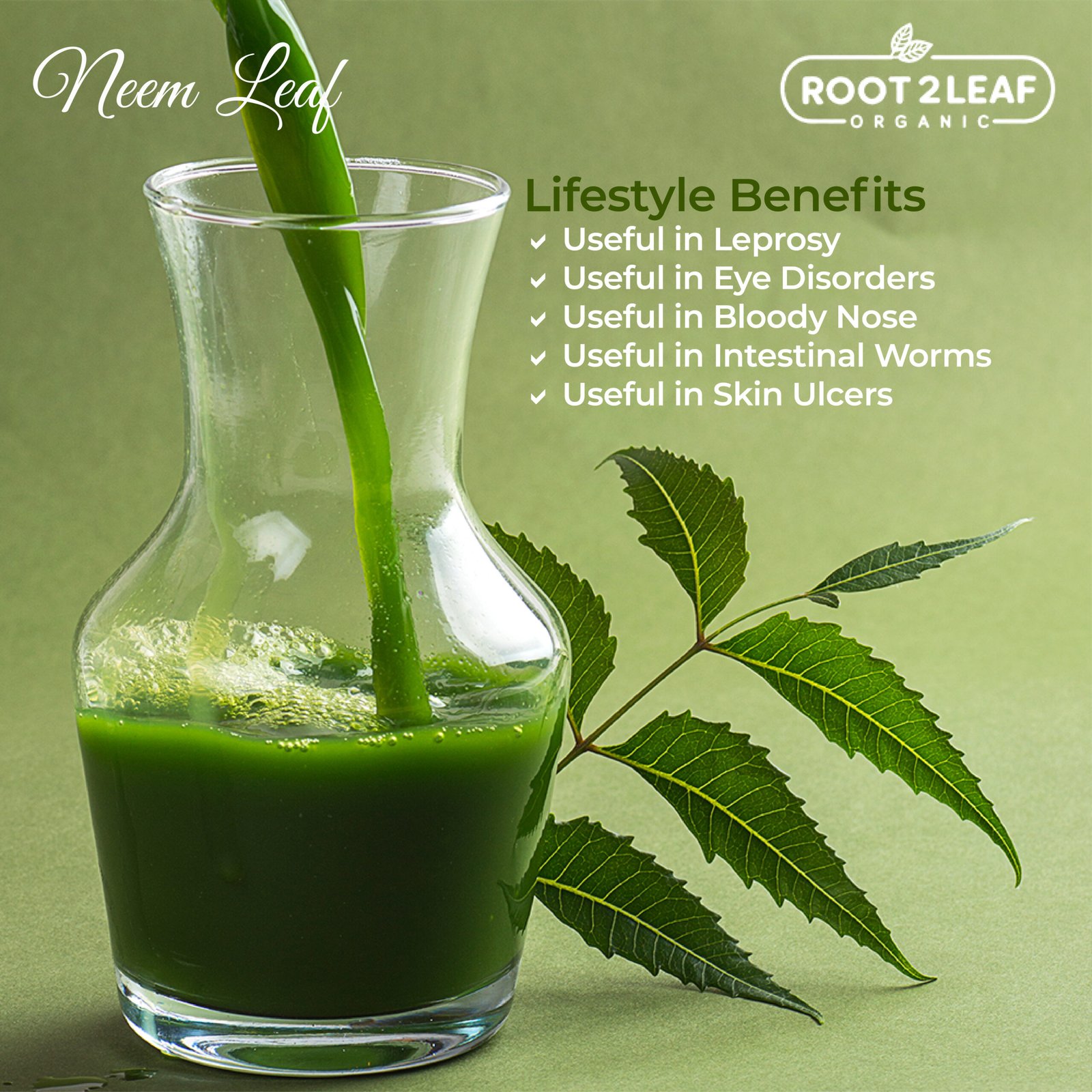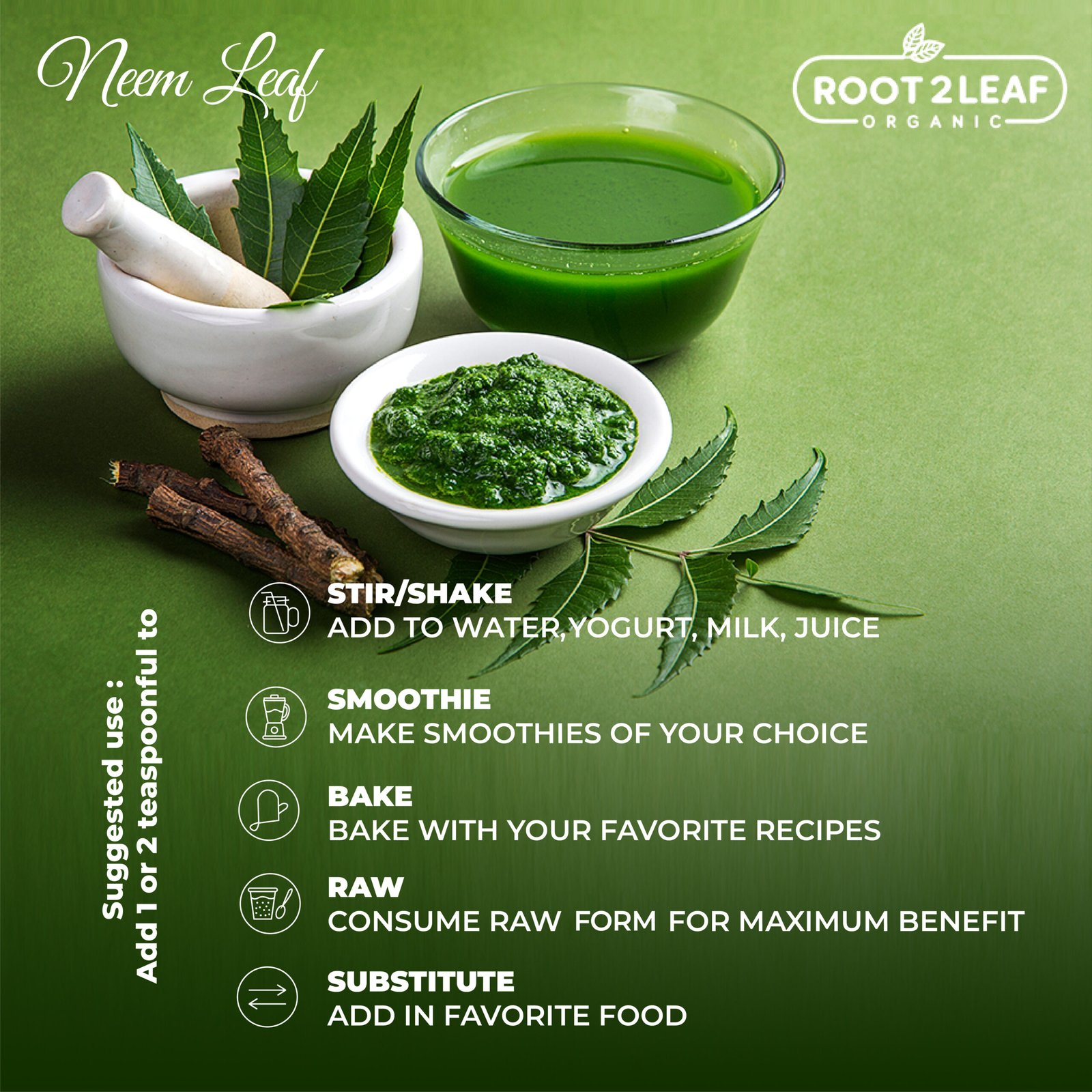 Root2Leaf Organic Neem Powder is a premium, nutrient-dense superfood crafted from hand-picked Azadirachta indica leaves. Processed under strict low-temperature conditions, we ensure the preservation of its vibrant natural color and complex  phytonutrient profile. Our powder is 100% certified organic, free from synthetic additives, and features a fine micronized texture for superior solubility. It bridges the gap between ancient herbal wisdom and modern nutritional needs, offering a clean-label solution for daily vitality.